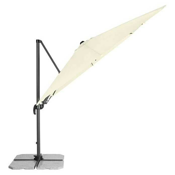 Der Pendelschirm Ravenna AX von Derby bietet komfortablen Sonnenschutz. Der Schirm wird über eine Kurbelmechanik geöffnet, das Schirmdach kann mit Hilfe eines Fußtasters um 360° gedreht und zusätzlich in beide Richtungen axial geschwenkt werden. Auf diese Weise kann das Schirmdach jedem Sonnenstand leicht angepasst werden. Das Gestell besteht aus Aluminium, die Streben sind aus Stahl gefertigt. Der Bezug des Pendelschirmes ist aus Polyester, regenabweisend, lichtecht und bietet einen guten UV-Schutz von 50+. Außerdem kann er abgenommen und per Hand gewaschen werden. Ein Sockelkreuz für Platten 50 x 50 cm ist inklusive, die Platten sind nicht inbegriffen. Für einen sicheren Stand wird ein Mindestsockelgewicht von 140 kg empfohlen.
