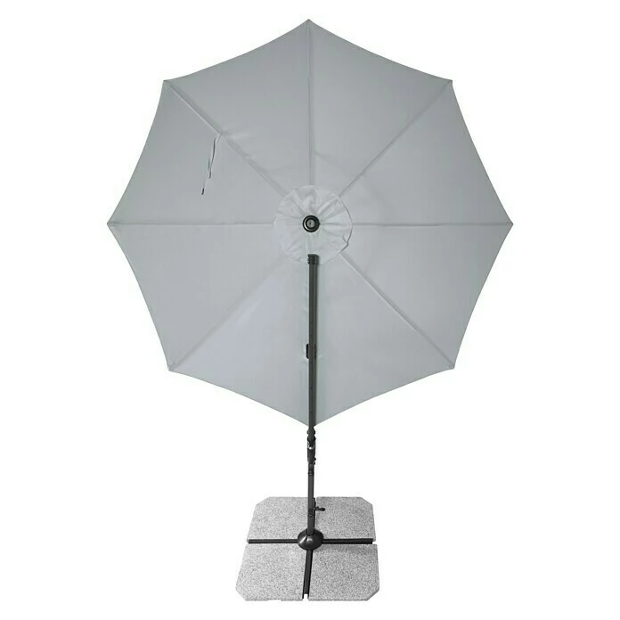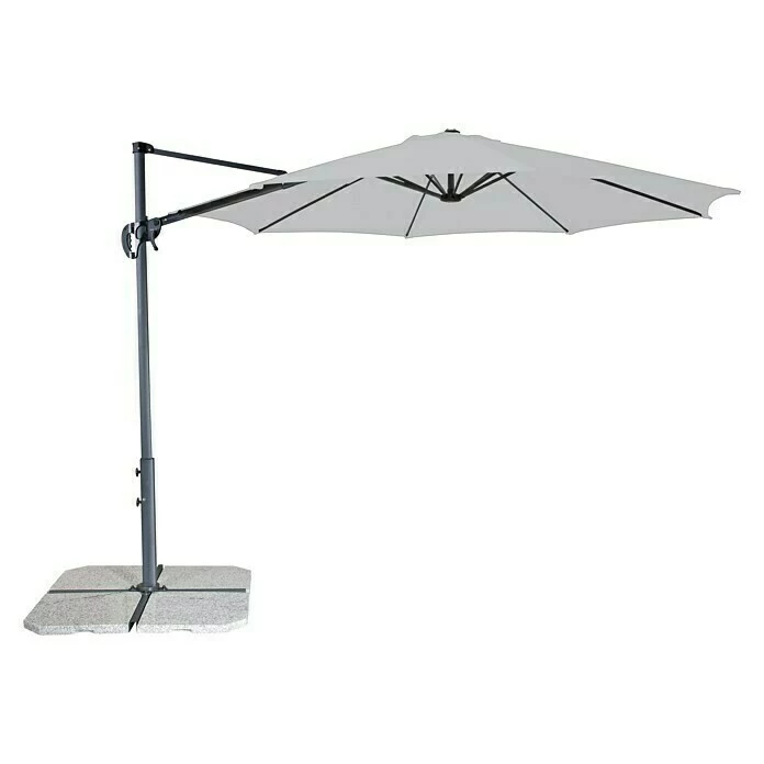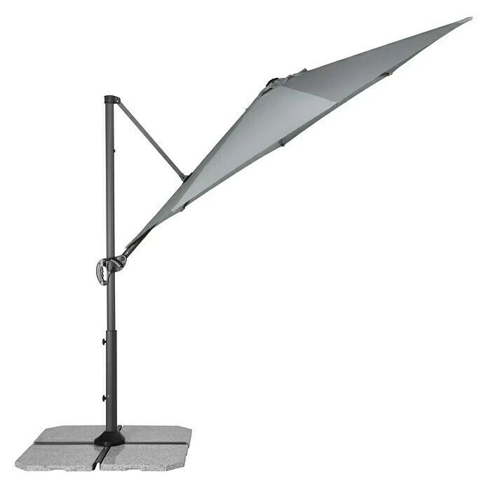 Der Derby Pendelschirm Ravenna Smart mit Kurbelmechanik ist leicht zu bedienen und vielseitig einstellbar. Das Schirmdach aus Polyestergewebe ist regenabweisend und bietet einen UV-Schutz von 50+. Der Aluminium-Schirmmast und die im Schirmdach eingearbeiteten Streben aus verzinktem Stahl machen den Pendelschirm besonders robust und standfest. Zudem ist der Schirm um 360° drehbar und in 6 Positionen schrägstellbar. Das Gestell mit Sockelkreuz benötigt 4 Platten mit einer Größe von je 50 x 50 x 4 cm und einem Gesamtgewicht von 100 kg. Bitte beachten Sie, dass die Platten nicht im Lieferumfang enthalten sind.