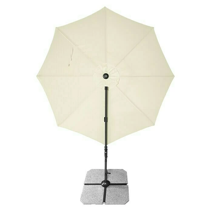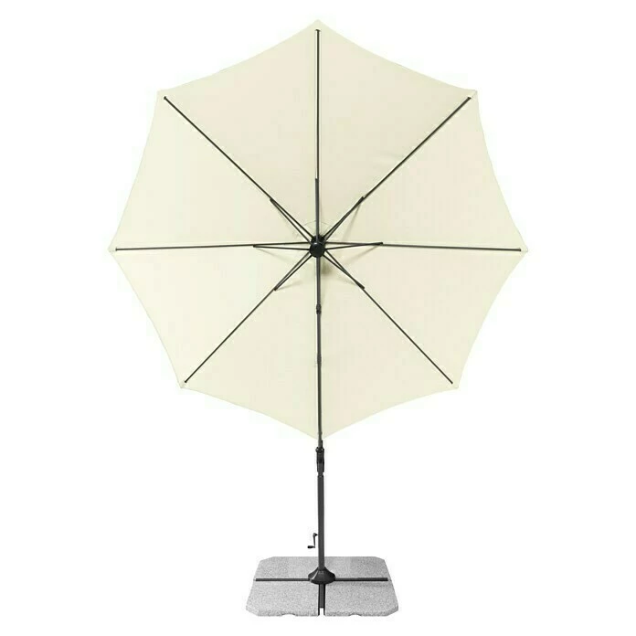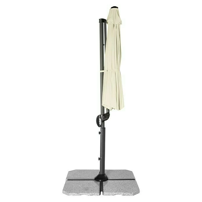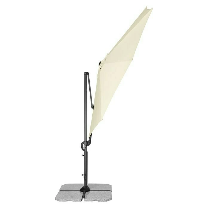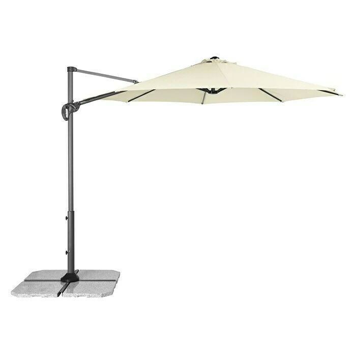 Der Derby Pendelschirm Ravenna Smart mit Kurbelmechanik ist leicht zu bedienen und vielseitig einstellbar. Das Schirmdach aus Polyestergewebe ist regenabweisend und bietet einen UV-Schutz von 50+. Der Aluminium-Schirmmast und die im Schirmdach eingearbeiteten Streben aus verzinktem Stahl machen den Pendelschirm besonders robust und standfest. Zudem ist der Schirm um 360° drehbar und in 6 Positionen schrägstellbar. Das Gestell mit Sockelkreuz benötigt 4 Platten mit einer Größe von je 50 x 50 x 4 cm und einem Gesamtgewicht von 100 kg. Bitte beachten Sie, dass die Platten nicht im Lieferumfang enthalten sind.