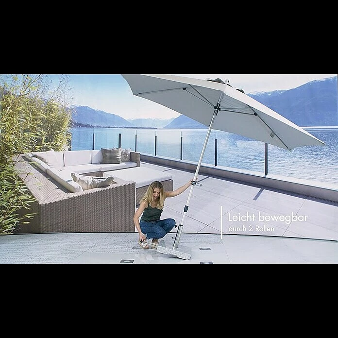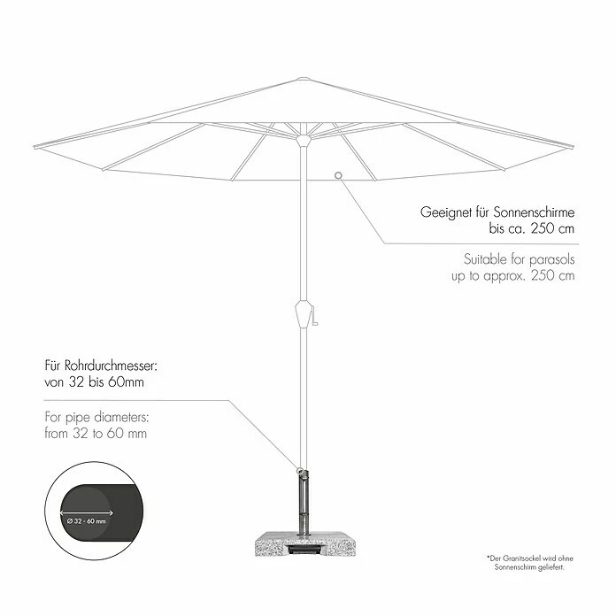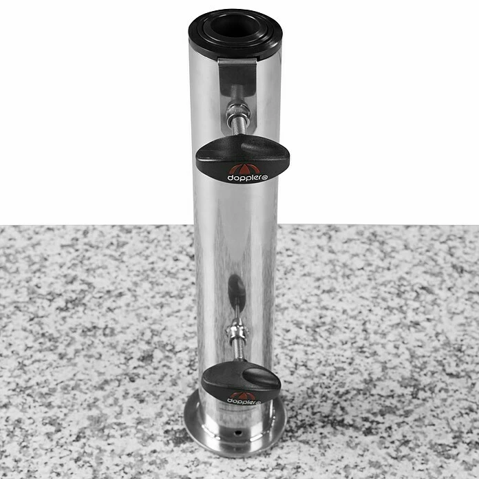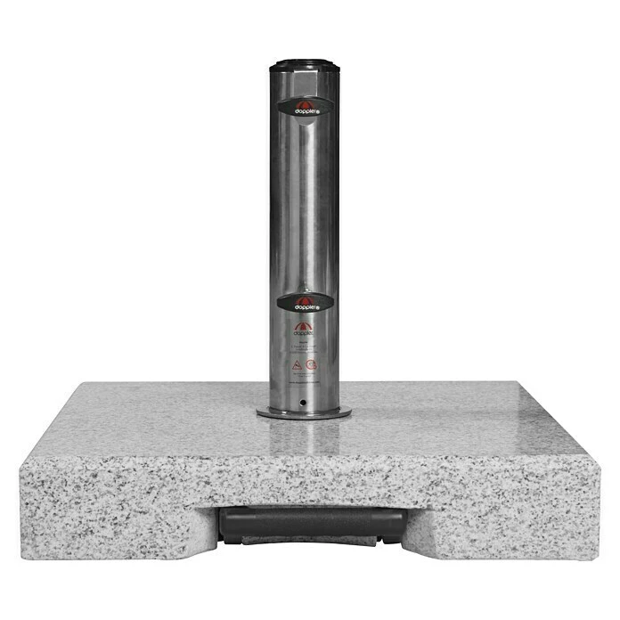 Der Doppler Active Trolley Granitschirmständer bietet Sonnenschirmen mit einer Spannbreite von bis zu 250 cm optimalen Halt. Durch die integrierten Rollen und den ausziehbaren Trolley-Griff ist leichter Transport gewährleistet. Das Aufsatzrohr besteht aus rostfreiem Edelstahl, mehrere Reduzierstücke ermöglichen das Verwenden von Schirmstöcken mit einem Durchmesser von 32 bis 60 mm. Das Standrohr ist ca. 30 cm hoch, die Höhe der Granitplatte beträgt ca. 8 cm.