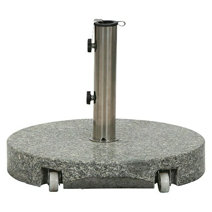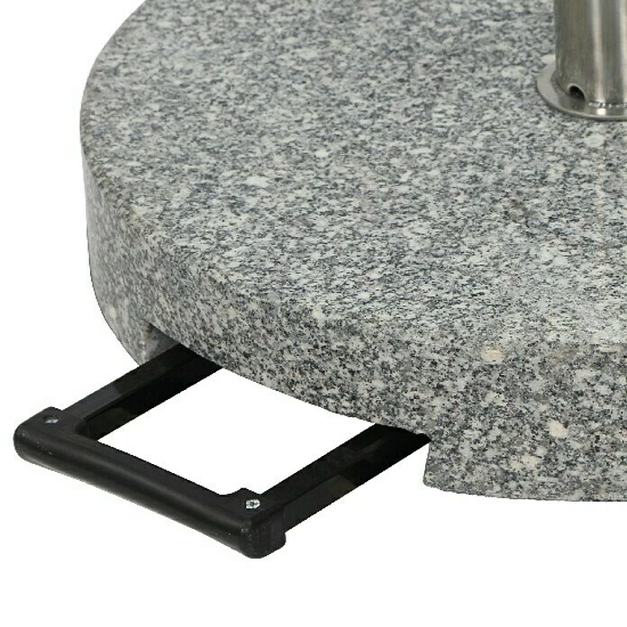 Der runde Granitschirmständer von Siena Garden gibt Sonnenschirmen idealen Halt und ausreichend Standfestigkeit. Der Schirmfuß aus Granit besitzt eine Halterung sowie einen ausziehbaren Teleskopgriff aus Edelstahl, mit dem der Ständer je nach Bedarf auf den vorhandenen Rollen bewegt werden kann. Mit einem Gewicht von insgesamt 40 kg eignet er sich für Schirmstöcke mit einem Durchmesser von 25 – 48 mm. Die Schirmstange wird durch zwei Stellschrauben befestigt.