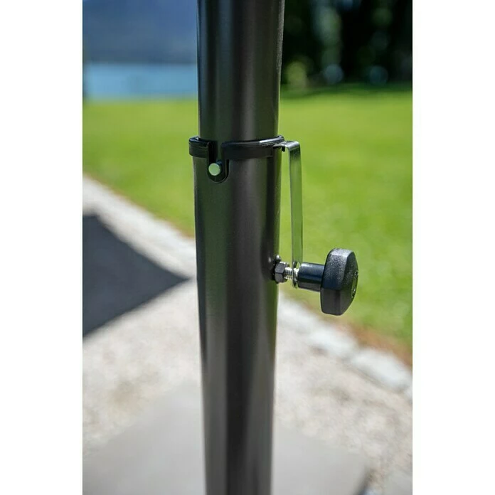 Der Ampelschirm Toscana von Sunfun bietet optimalen Schutz vor direkter Sonneneinstrahlung. Durch eine Kurbel am pulverlackbeschichtetem Aluminium-Schirmstock ist eine einfache Handhabung garantiert. Das Schirmdach, welches einen UV-Schutz von 40+ bietet, ist mit einem Bezug aus 100% Polyester 180g/m² bespannt und kann geneigt werden. So kann der Schatten je nach Sonnenstand jederzeit optimal ausgerichtet werden. Der Bezug ist per Hand waschbar und leicht wasserabweisend.