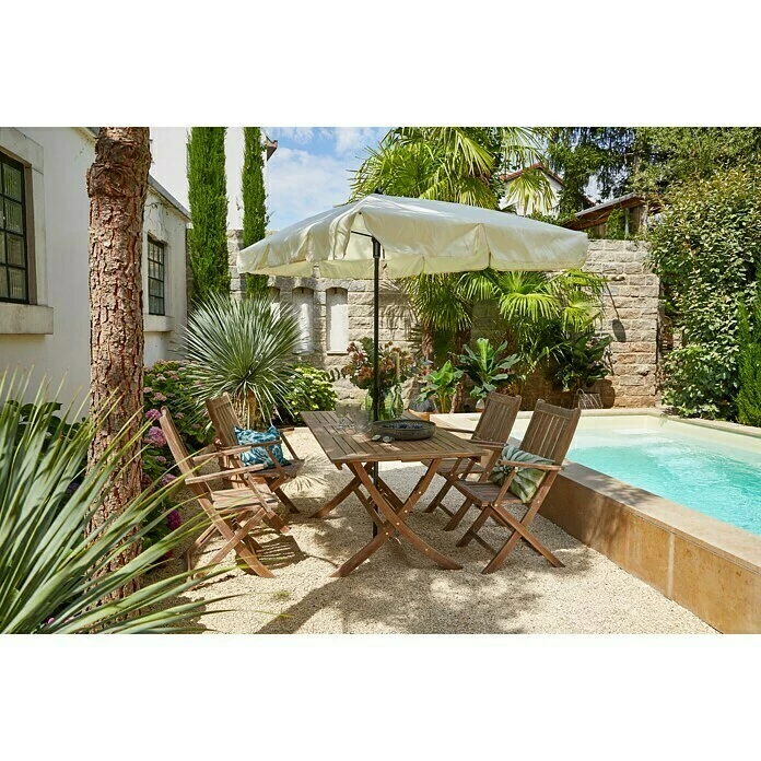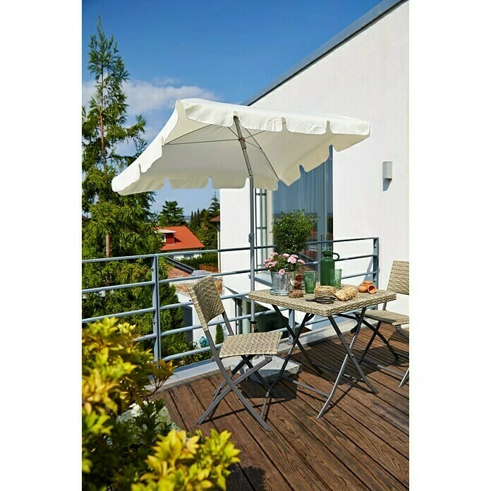 Der Balkonschirm Messina II von Sunfun bietet optimalen Schutz vor direkter Sonneneinstrahlung. Der Bezug besteht aus robustem Polyester, das Gestell aus pulverlackbeschichtetem Stahl. Mit Hilfe des Knick-Gelenkes lässt sich der Schirm in die gewünschte Position neigen.
