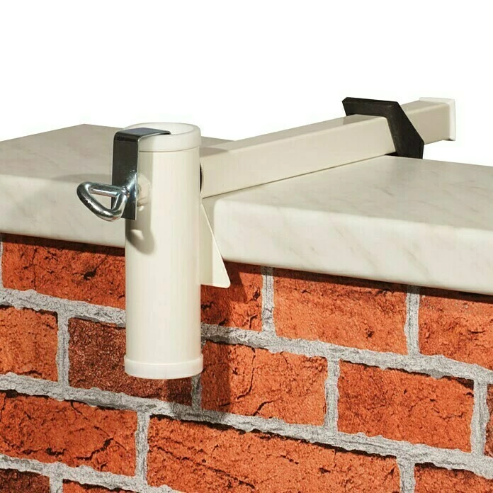 Die weiße Sonnenschirmhalterung H von Videx ist eine sehr platzsparende Möglichkeit einen Sonnenschirm an einer Balkon-Mauer zu befestigen. Die Halterung ist aus verzinktem Stahl gefertigt und somit witterungsbeständig. Es können Sonnenschirmstöcke bis Ø 35 mm befestigt werden.